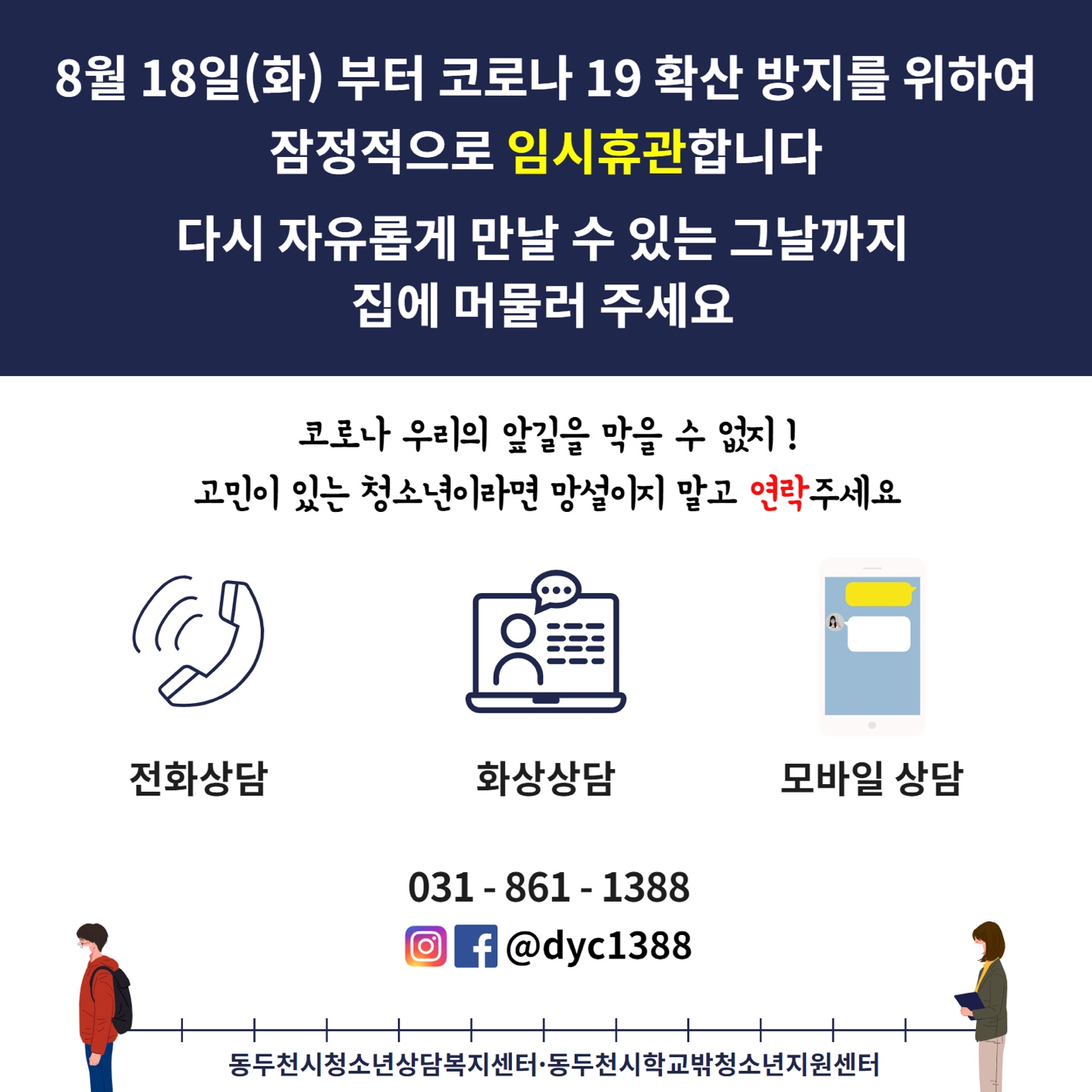 동두천시청소년상담복지센터는 코로나19 확산방지를 위해 08월 18일(화)부터 잠정적으로 임시휴관합니다.
