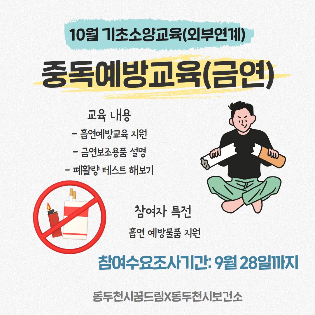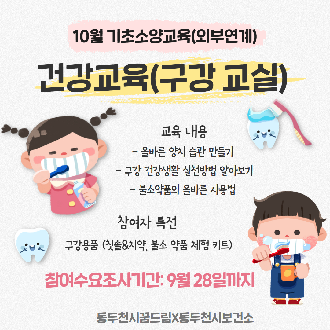 교육 주제로는 청소년들의 건강 증진이 목적인 건강교육(구강 교실)과 중독예방교육(금연)으로 구성되어 있습니다.