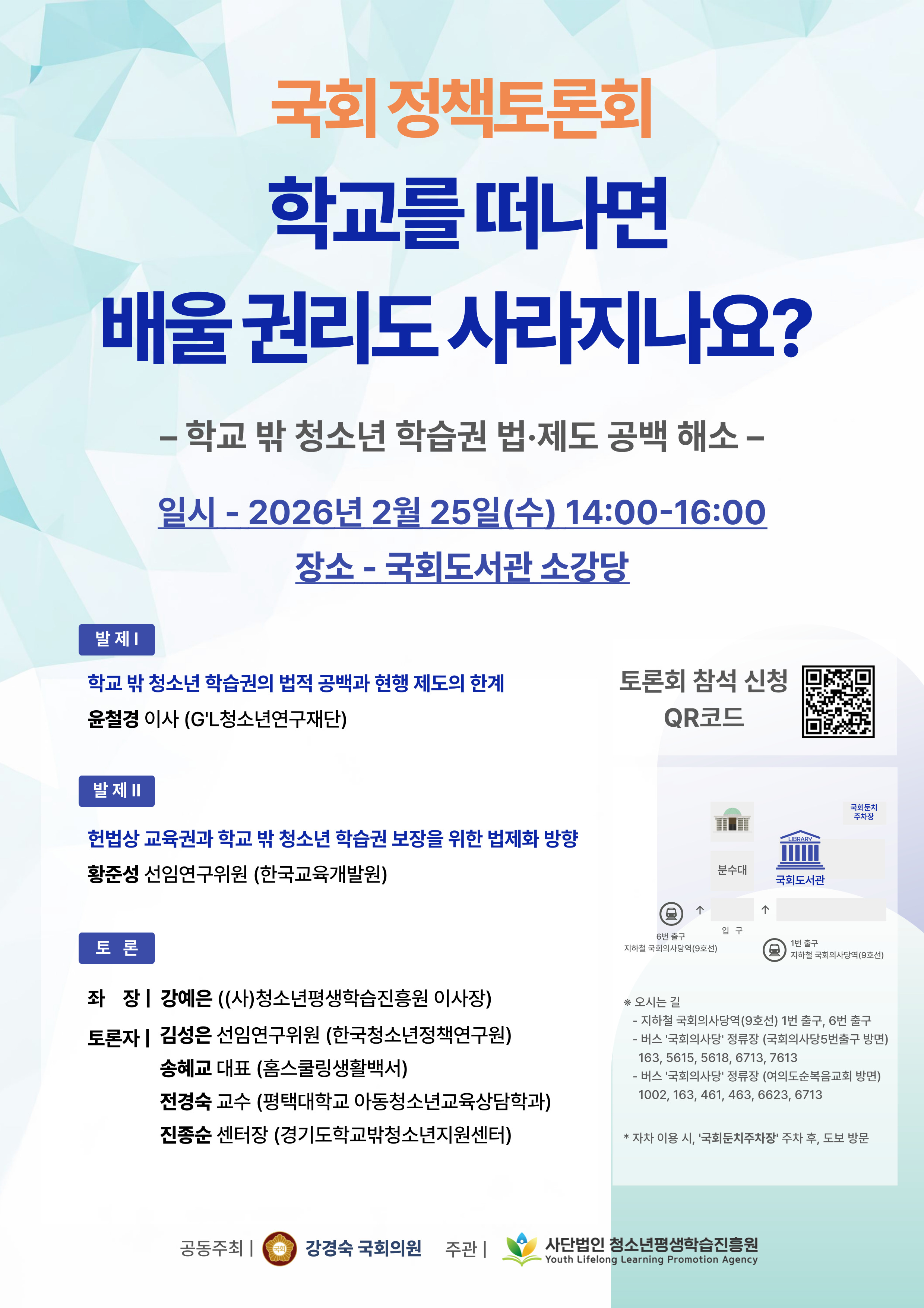 이번 정책토론회는 학교 밖 청소년의 학습권이 현행 법·제도 안에서 충분히 보장되지 못하고 있는 현실을 점검하고,학습권의 법적 근거 마련, 학습경험 인정체계 구축, 국가와 지방자치단체의 책무 강화를 중심으로정책·입법적 개선 방향을 논의하기 위해 기획된 공익 목적의 토론회 입니다.